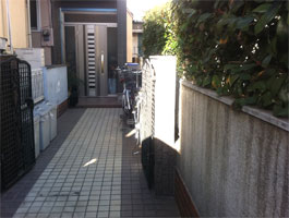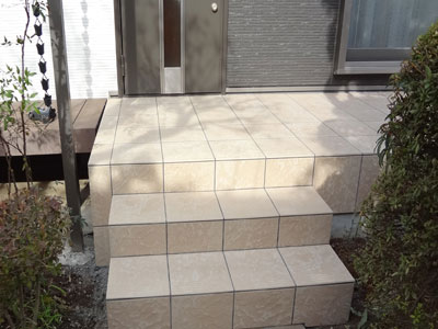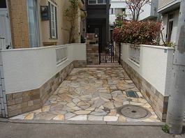 壁を清潔感のある白に塗り替え自然石の乱張りでアンティーク風に仕上げています。 新たに門柱と門扉を取り付けました。