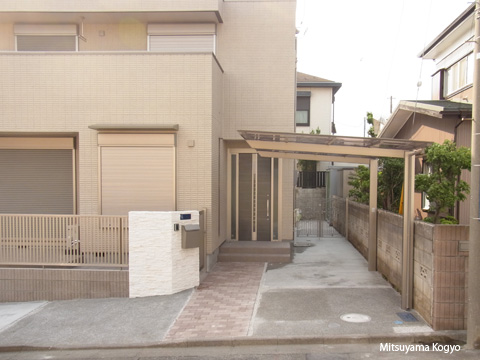 横浜市 クローズ12-1 カーポート:LIXILアーキフィットレギュラー インターロッキング:東洋工業リヴァルペイブ インターロッキングのアプローチでガレージを自然にゾーニング。