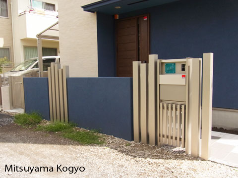 三鷹市 クローズ14-1 YKKap シンプルモダンポストユニット 門袖を建物と合わせたブルーで統一感をもたせました。